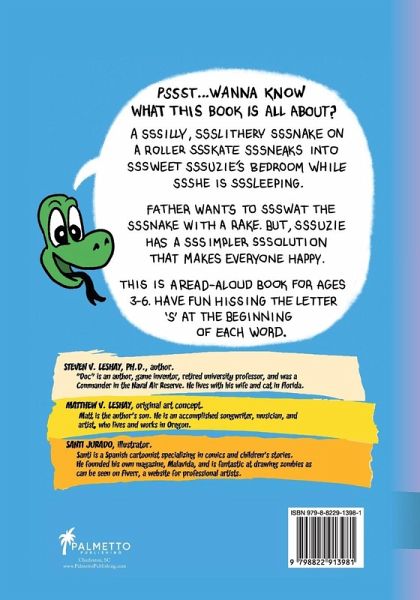 Sssweet Sssuzie is sssleeping when a sssilly, ssslithery sssnake zooms into her room on a roller ssskate. Father comes in with a rake to get rid of the sssnake. Sssusie sssuggests a sssimpler sssolution that ends up making everybody happy. This Read-Aloud Book will become a favorite bedtime ssstory for 4-6-year-olds when the first letter 's' of each word has a hissing sssound. Recipient of 2024 President's Book Awards Silver Medal Winner (Florida Authors and Publishers Association)