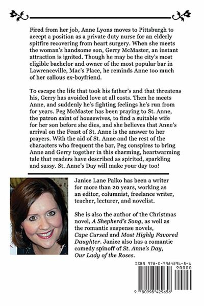 Fired from her job, Anne Lyons moves to Pittsburgh to accept a position as a private duty nurse for an elderly spitfire recovering from heart surgery. When she meets the woman’s handsome son, Gerry McMaster, an instant attraction is ignited. Though he may be the city’s most eligible bachelor and owner of the most popular bar in Lawrenceville, Mac’s Place, he reminds Anne too much of her callous ex-boyfriend. To escape the life that took his father’s and that threatens his, Gerry has avoided love at all costs. Then he meets Anne, and suddenly he’s fighting feelings he’s run from for years. Peg McMaster has been praying to St. Anne, the patron saint of housewives, to find a suitable wife for her son before she dies, and she believes that Anne's arrival on the Feast of St. Anne is the answer to her prayers. With the aid of St. Anne and the rest of the characters who frequent the bar, Peg conspires to bring Anne and Gerry together in this charming, heartwarming tale that readers have described as spirited, sparkling, and sassy. St. Anne’s Day will make your day too!