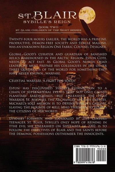 Twenty-four hours earlier the world was a pristine, productive, demon-free society and Sybille Malone an unknown Region One Fabric Counsel designer. Global Good's curator and guardian of banished relics warehoused in the Arctic Region, Eston Cote, needs to act fast. As Global Good's North Quad leader, he must prepare his colleagues in the other three Quadrants of the world for something they have never known... warfare. Celestial warfare. A fight for souls. Eston has discovered Sybille's connection to a chain of supernatural events that not only caused planetary earthquakes, but unleashed the Holy Warrior St. Michael the Archangel and his enemies. Michael's sole mission is to defend Sybille's calling, slaying the hounds of hell who threaten to possess the citizens of her world. Divinely foreseen and journaled by 21st century teenager St. Blair, Sybille's only hope of reining in the evil she unleashed on September 14, 2202, is to follow the directives of Blair and the saints before the demonic possessions outnumber the innocents.
