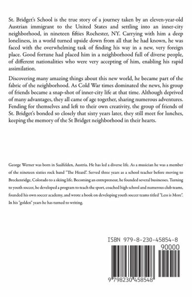 St. Bridget's School is the true story of a journey taken by an eleven-year-old Austrian immigrant to the United States and settling into an inner-city neighborhood, in nineteen fifties Rochester, NY. Carrying with him a deep loneliness, in a world turned upside down from all that he had known, he was faced with the overwhelming task of finding his way in a new, very foreign place. Good fortune had placed him in a neighborhood full of diverse people, of different nationalities who were very accepting of him, enabling his rapid assimilation. Discovering many amazing things about this new world, he became part of the fabric of the neighborhood. As Cold War times dominated the news, his group of friends became a snap-shot of inner-city life at that time. Although deprived of many advantages, they all came of age together, sharing numerous adventures. Fending for themselves and left to their own creativity, the group of friends of St. Bridget's bonded so closely that sixty years later, they still meet for lunches, keeping the memory of the St Bridget neighborhood in their hearts.