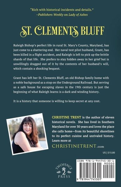 Raleigh Bishop's perfect life in rural St. Mary's County, Maryland, has just come to a shattering end. Her naval test pilot husband, Grant, has been killed in a flight accident, and Raleigh is left to pick up the brittle shards of that life. She prefers to stay hidden away in her grief but is unwillingly dragged out of it by the contents of her husband's will, which contain a shocking bequest. Grant has left her St. Clements Bluff, an old Bishop family home with a noble background as a stop on the Underground Railroad. But serving as a safe house for escaping slaves in the 19th century is just the beginning of what Raleigh learns is a dark and winding history. It is a history that someone is willing to keep secret at any cost. Christine Trent has lived in Southern Maryland for over 30 years and loves the place she calls home-from its beautiful shorelines to its perfect cuisine and unrivaled history. Learn more at www.ChristineTrent.com.