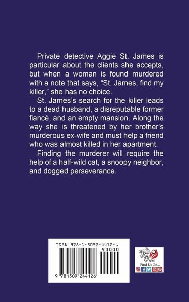 Private detective Aggie St. James is particular about the clients she accepts, but when a woman is found murdered with a note that says, "St. James, find my killer," she has no choice. St. James's search for the killer leads to a dead husband, a disreputable former fiancé, and an empty mansion. Along the way she is threatened by her brother's murderous ex-wife and must help a friend who was almost killed in her apartment. Finding the murderer will require the help of a half-wild cat, a snoopy neighbor, and dogged perseverance.