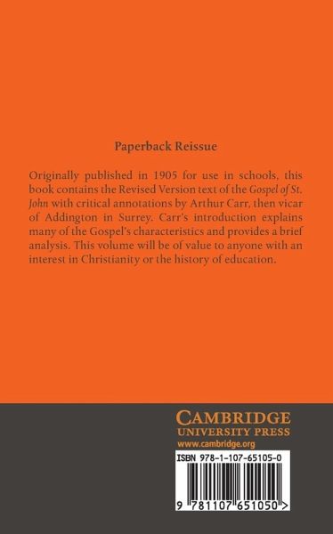 Originally published in 1905 for use in schools, this book contains the Revised Version text of the Gospel of St John with critical annotations by Arthur Carr, then vicar of Addington in Surrey. Carr's introduction explains many of the Gospel's characteristics and provides a brief analysis. This volume will be of value to anyone with an interest in Christianity or the history of education.
