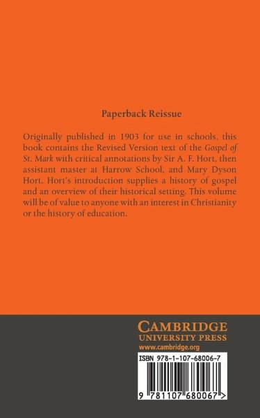 Originally published in 1903 for use in schools, this book contains the Revised Version text of the Gospel of St Mark with critical annotations by Sir A. F. Hort, then assistant master at Harrow School, and Mary Dyson Hort. Hort's introduction supplies a history of gospel and an overview of their historical setting. This volume will be of value to anyone with an interest in Christianity or the history of education.