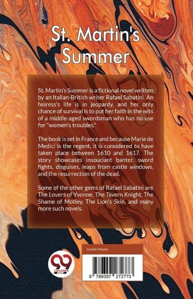 St. Martin's Summer is a fictional novel written by an Italian-British writer Rafael Sabatini. An heiress's life is in jeopardy, and her only chance of survival is to put her faith in the wits of a middle-aged swordsman who has no use for "women's troubles." The book is set in France and because Marie de Medici is the regent, it is considered to have taken place between 1610 and 1617. The story showcases insouciant banter, sword fights, disguises, leaps from castle windows, and the resurrection of the dead. Some of the other gems of Rafael Sabatini are The Lovers of Yvonne, The Tavern Knight, The Shame of Motley, The Lion's Skin, and many more such novels.