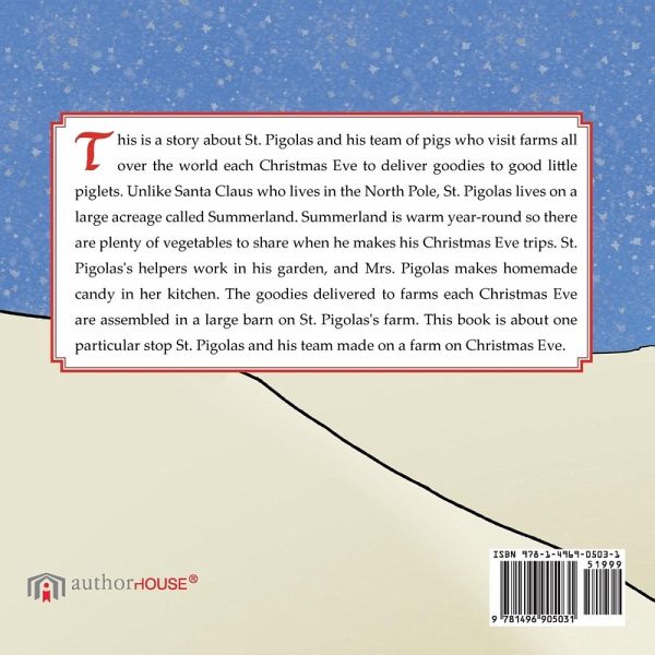 This is a story about St. Pigolas and his team of pigs who visit farms all over the world each Christmas Eve to deliver goodies to good litt le piglets. Unlike Santa Claus who lives in the North Pole, St. Pigolas lives on a large acreage called Summerland. Summerland is warm year-round so there are plenty of vegetables to share when he makes his Christmas Eve trips. St. Pigolas's helpers work in his garden, and Mrs. Pigolas makes homemade candy in her kitchen. The goodies delivered to farms each Christmas Eve are assembled in a large barn on St. Pigolas's farm. This book is about one particular stop St. Pigolas and his team made on a farm on Christmas Eve.