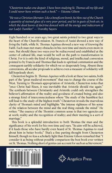 "Chesterton makes one despair. I have been studying St. Thomas all my life and I could never have written such a book." - Etienne Gilson "He was a Christian liberator. Like a beneficent bomb, he blew out of the Church a quantity of stained glass of a very poor period, and let in gusts of fresh air, in which the dead leaves of doctrine danced with all the energy and indecorum of our Lady's Tumbler." - Dorothy Sayers According to Chesterton, "once Christ had Risen, it was inevitable that Aristotle should rise again." The synthesis between Christianity and Aristotle could only strengthen the believer's affirmation of the reality and goodness of created being; and also a strange kind of interconnectedness where "the study of the humblest fact will lead to the study of the highest truth." Chesterton reveals the marvelous clarity of Thomas's mind and highlights "the intense rightness of his sense of the relation between the mind and the real thing outside the mind." This book is a splendid introduction to both Thomas the man and the significance of his work for his own time and ours. No less a scholarly light than Etienne Gilson remarked that "I consider it as being without possible comparison the best book ever written on St. Thomas. Nothing short of genius can account for such an achievement."