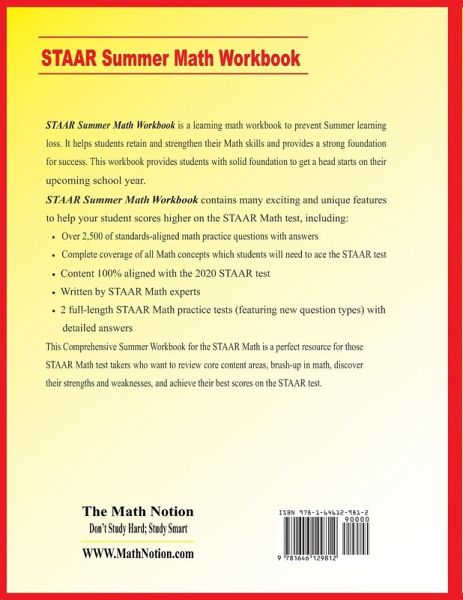 Prepare for the STAAR Math test with a perfect workbook! STAAR Summer Math Workbook is a learning math workbook to prevent Summer learning loss. It helps students retain and strengthen their Math skills and provides a strong foundation for success. This workbook provides students with solid foundation to get a head starts on their upcoming school year. STAAR Summer Math Workbook is designed by top test prep experts to help students prepare for the STAAR Math test. It provides test-takers with an in-depth focus on the math section of the test, helping them master the essential math skills that test-takers find the most troublesome. This is a prestigious resource for those who need an extra practice to succeed on the STAAR Math test in the summer. STAAR Summer Math Workbook contains many exciting and unique features to help your student scores higher on the STAAR Math test, including: * Over 2,500 of standards-aligned math practice questions with answers * Complete coverage of all Math concepts which students will need to ace the STAAR test * Content 100% aligned with the latest STAAR test * Written by STAAR Math experts * 2 full-length STAAR Math practice tests (featuring new question types) with detailed answers This Comprehensive Summer Workbook for the STAAR Math is a perfect resource for those STAAR Math test takers who want to review core content areas, brush-up in math, discover their strengths and weaknesses, and achieve their best scores on the STAAR test. Published By: The Math Notion www.mathnotion.com