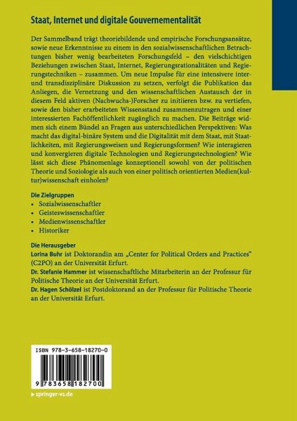 Der Sammelband trägt theoriebildende und empirische Forschungsansätze, sowie neue Erkenntnisse zu einem in den sozialwissenschaftlichen Betrachtungen bisher wenig bearbeiteten Forschungsfeld - den vielschichtigen Beziehungen zwischen Staat, Internet, Regierungsrationalitäten und Regierungstechniken - zusammen. Um neue Impulse für eine intensivere inter- und transdisziplinäre Diskussion zu setzen, verfolgt die Publikation das Anliegen, die Vernetzung und den wissenschaftlichen Austausch der in diesem Feld aktiven (Nachwuchs-)Forscher zu initiieren bzw. zu vertiefen, sowie den bisher erarbeiteten Wissensstand zusammenzutragen und einer interessierten Fachöffentlichkeit zugänglich zu machen. Die Beiträge widmen sich einem Bündel an Fragen aus unterschiedlichen Perspektiven: Was macht das digital-binäre System und die Digitalität mit dem Staat, mit Staatlichkeiten, mit Regierungsweisen und Regierungsformen? Wie interagieren und konvergieren digitale Technologien und Regierungstechnologien? Wie lässt sich diese Phänomenlage konzeptionell sowohl von der politischen Theorie und Soziologie als auch von einer politisch orientierten Medien(kultur)wissenschaft einholen?