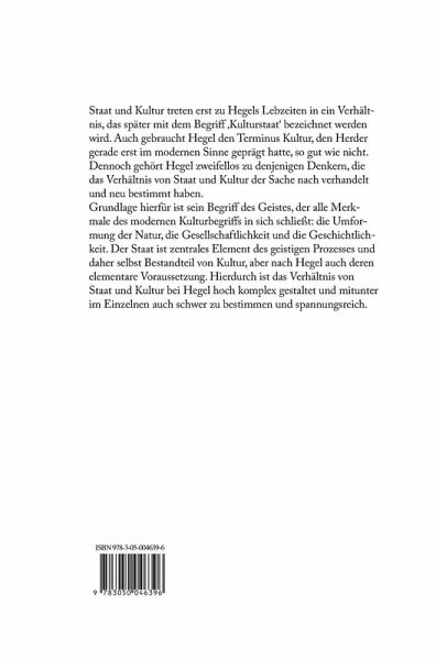 Staat und Kultur treten erst zu Hegels Lebzeiten in ein Verhältnis, das später mit dem Begriff 'Kulturstaat' bezeichnet werden wird. Auch gebraucht Hegel den Terminus Kultur, den Herder gerade erst im modernen Sinne geprägt hatte, so gut wie nicht. Dennoch gehört Hegel zweifellos zu denjenigen Denkern, die das Verhältnis von Staat und Kultur der Sache nach verhandelt und neu bestimmt haben. Grundlage hierfür ist sein Begriff des Geistes, der alle Merkmale des modernen Kulturbegriffs in sich schließt: die Umformung der Natur, die Gesellschaftlichkeit und die Geschichtlichkeit. Der Staat ist zentrales Element des geistigen Prozesses und daher selbst Bestandteil von Kultur, aber nach Hegel auch deren elementare Voraussetzung. Hierdurch ist das Verhältnis von Staat und Kultur bei Hegel hoch komplex gestaltet und mitunter im Einzelnen auch schwer zu bestimmen und spannungsreich.