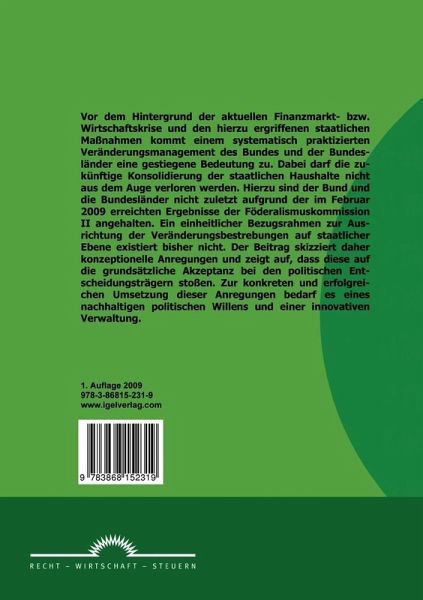 Vor dem Hintergrund der aktuellen Finanzmarkt- bzw. Wirtschaftskrise und den hierzu ergriffenen staatlichen Maßnahmen kommt einem systematisch praktizierten Veränderungsmanagement des Bundes und der Bundesländer eine gestiegene Bedeutung zu. Dabei darf die zukünftige Konsolidierung der staatlichen Haushalte nicht aus dem Auge verloren werden. Hierzu sind der Bund und die Bundesländer nicht zuletzt aufgrund der im Februar 2009 erreichten Ergebnisse der Föderalismuskommission II angehalten. Ein einheitlicher Bezugsrahmen zur Ausrichtung der Veränderungsbestrebungen auf staatlicher Ebene existiert bisher nicht. Der Beitrag skizziert daher konzeptionelle Anregungen und zeigt auf, dass diese auf die grundsätzliche Akzeptanz bei den politischen Entscheidungsträgern stoßen. Zur konkreten und erfolgreichen Umsetzung dieser Anregungen bedarf es eines nachhaltigen politischen Willens und einer innovativen Verwaltung.