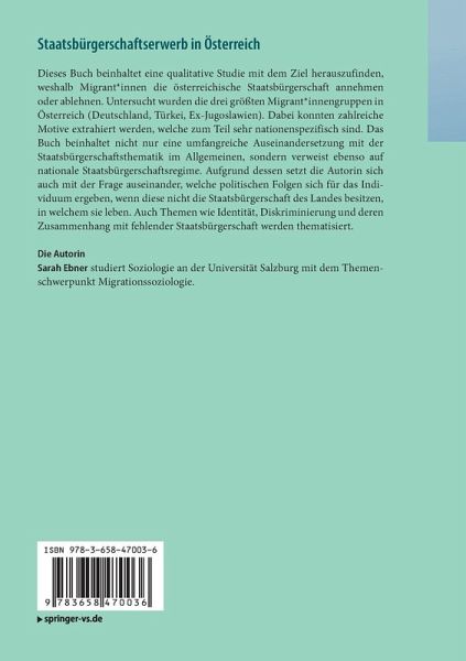 Dieses Buch beinhaltet eine qualitative Studie mit dem Ziel herauszufinden, weshalb Migrant_innen die österreichische Staatsbürgerschaft annehmen oder ablehnen. Untersucht wurden die drei größten Migrant_innengruppen in Österreich (Deutschland, Türkei, Ex-Jugoslawien). Dabei konnten zahlreiche Motive extrahiert werden, welche zum Teil sehr nationenspezifisch sind. Das Buch beinhaltet nicht nur eine umfangreiche Auseinandersetzung mit der Staatsbürgerschaftsthematik im Allgemeinen, sondern verweist ebenso auf nationale Staatsbürgerschaftsregime. Aufgrund dessen setzt die Autorin sich auch mit der Frage auseinander, welche politischen Folgen sich für das Individuum ergeben, wenn diese nicht die Staatsbürgerschaft des Landes besitzen, in welchem sie leben. Auch Themen wie Identität, Diskriminierung und deren Zusammenhang mit fehlender Staatsbürgerschaft werden thematisiert.