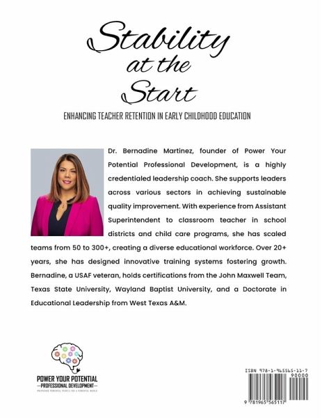 Looking for practical strategies to enhance teacher retention and overcome the challenges of running an early childhood program?Dive into the revolutionary book "Stability at the Start" and transform your Head Start program into a beacon of innovation and compassion! Discover the secrets to creating a culture of stability and unleash your leadership potential with this comprehensive guide and workbook. Benefits:Gain a deep understanding of the root causes behind high attrition rates in early childhood education. Empower yourself with strategies and insights to enhance teacher retention and foster a supportive environment. Learn how to create an atmosphere of innovation, compassion, and learning within your early childhood program. Overcome the challenges of evolving educational landscapes and trends. Take the first step towards transforming your program without feeling overwhelmed! Ready to make a difference? Don't wait! Dr. Bernadine Martinez, founder of Power Your Potential Professional Development, is a highly credentialed leadership coach. She supports leaders across various sectors in achieving sustainable quality improvement. With experience from Assistant Superintendent to classroom teacher in school districts and child care programs, she has scaled teams from 50 to 300+, creating a diverse educational workforce. Over 20+ years, she has designed innovative training systems fostering growth. Bernadine, a USAF veteran, holds certifications from the John Maxwell Team, Texas State University, Wayland Baptist University, and a Doctorate in Educational Leadership from West Texas A&M.