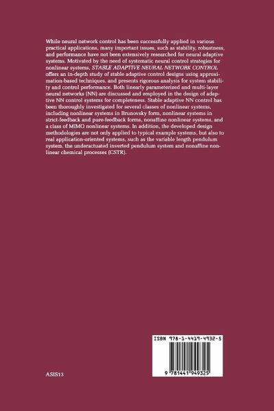 Recent years have seen a rapid development of neural network control tech niques and their successful applications. Numerous simulation studies and actual industrial implementations show that artificial neural network is a good candidate for function approximation and control system design in solving the control problems of complex nonlinear systems in the presence of different kinds of uncertainties. Many control approaches/methods, reporting inventions and control applications within the fields of adaptive control, neural control and fuzzy systems, have been published in various books, journals and conference proceedings. In spite of these remarkable advances in neural control field, due to the complexity of nonlinear systems, the present research on adaptive neural control is still focused on the development of fundamental methodologies. From a theoretical viewpoint, there is, in general, lack of a firmly mathematical basis in stability, robustness, and performance analysis ofneural network adaptive control systems. This book is motivated by the need for systematic design approaches for stable adaptive control using approximation-based techniques. The main objec tives of the book are to develop stable adaptive neural control strategies, and to perform transient performance analysis of the resulted neural control systems analytically. Other linear-in-the-parameter function approximators can replace the linear-in-the-parameter neural networks in the controllers presented in the book without any difficulty, which include polynomials, splines, fuzzy systems, wavelet networks, among others. Stability is one of the most important issues being concerned if an adaptive neural network controller is to be used in practical applications.