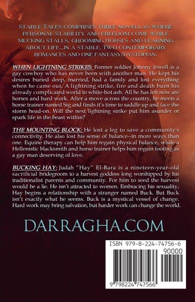 Stable Tales comprises three man love novellas where personal stability and freedom come while mucking stalls, grooming horses and learning about life...in a stable. Two contemporary romances and one fantasy/dystopian. When Lightning Strikes: Former soldier Johnny Jewell is a gay cowboy who has never been with another man. He kept his desires buried deep, married, had a family and lost everything when he came out. A lightning strike, fire and death burn his already complicated world to white-hot ash. All he has left now are horses and hard work. After a move across the country, he meets a horse trainer named Sig and finds it's time to saddle up and face the storm head-on. Will the next lightning strike put him asunder or spark life in the beast within? The Mounting Block: He lost a leg to save a community's connectivity. He also lost his sense of balance--in more ways than one. Equine therapy can help him regain physical balance, while a Hellenistic blacksmith and horse trainer helps him regain footing as a gay man deserving of love. Equine therapy can help him regain physical balance, while a Hellenistic blacksmith and horse trainer helps him regain footing as a gay man deserving of love Bucking Hay: Judah "Hay" El-Bara is a nineteen-year-old sacrificial bridegroom to a harvest goddess long worshipped by his traditionalist parents and community. For him to seed the harvest would be a lie. He isn't attracted to women. Embracing his sexuality, Hay begins a relationship with a stranger named Buck. But Buck isn't exactly what he seems. Buck is a mystical vessel of change. Hard work may bring salvation, but harder work can change the world.