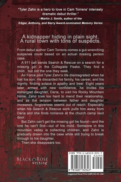 "A harrowing rescue thriller with a truly magnetic hero at its core." -BestThrillers.com A kidnapper hiding in plain sight. A rural town with tons of suspects. From award-winning author Cam Torrens comes a gut-wrenching suspense novel based on an actual missing person case. A 911 call sends Search & Rescue on a search for a missing girl in the Collegiate Peaks. They find a child...but not the one they seek. Air Force pilot Tyler Zahn's life disintegrated when he lost his son. He discarded his family, his career, and his dignity, finding solace in apathy and beer. Eight years later, armed with new confidence, he invites his estranged daughter, Daria, to visit his Rocky Mountain home. Zahn tries too hard to mend their relationship, and as the tension between father and daughter increases, forgiveness seems out of reach. Especially when his Search & Rescue work pulls him away from Daria and she finds romance at the church camp next door. But Zahn can't get the missing girl he found-and the one he can't find-out of his mind. Someone in this mountain valley is collecting children, and Zahn is gradually drawn into the case while still trying to break through to his daughter. Then she disappears too.