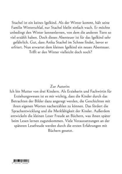 Stachel ist ein keines Igelkind. Als der Winter kommt, hält seine Familie Winterschlaf, nur Stachel bleibt einfach wach. Er möchte unbedingt den Winter treffen, von dem die anderen Tiere so viel erzählt haben. Doch dieses Abenteuer ist für das Igelkind sehr gefährlich. Gut, dass Anika Stachel im Schnee findet, bevor er erfriert. Nun erwartet dem kleinen Igelkind ein neues Abenteuer. Trifft er den Winter vielleicht doch noch?