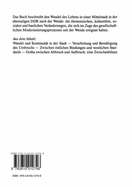 A Wandel und Kontinuität in Gotha.- 1. Zum theoretischen Rahmen der Untersuchung.- Der Umbruch in der DDR als Modernisierungsfall (13). Phasen der Befmdlichkeit in der Zeit nach der Wende (21). Der lokale Lebenszusammenhang als pars pro toto (25). Zusammenfassung (29).- 2. Die methodische Anlage der Untersuchung.- Die Auswahl der mittelgroßen Stadt Gotha (32). Die Verfahren im einzelnen (33). Zusammenfassung (45).- 3. Die Stadt Gotha ein Kurzportrait.- Zur Entwicklung der Stadt (50). Gotha als Residenzstadt (59). Gotha als Kulturstadt (60). Gotha als Industriestadt und Stadt der Arbeiterbewegung (62). Die Zeit der DDR bis zur Gegenwart (65).- 4. Von der Wende zur Vereinigung.- Der Verlauf der Wende in Gotha (68). Die Anfänge (68). Der Höhepunkt der Mobilisierung (71). Das Stadium der Institutionalisierung (75). Zwischenresümee (86). Die politische Aktivierung der Barger (89). Währungsunion und Vereinigung (92). Zusammenfassung (98).- B Verarbeitung und Bewältigung des Umbruchs.- 5. Zum Wandel politischer Institutionen und Orientierungen.- Der Beginn kommunaler Selbstverwaltung (100). Zum Wandel lokaler politischer Eliten (106). Zwischenresümee (116). Von der Einheitspartei zum Mehrparteiensystem (117). Politische Partizipation und kommunalpolitischer Prozeß (120). Wandel der politischen Orientierungen (126). Wahlverhalten im Wandel (126). Parteipräferenz und politische Einstellungen (130). Wandel und Konstanz von Einstellungen zu den Folgen der Vereinigung (134). Zusammenfassung (138).- 6. Zum Wandel der ökonomischen Situation.- Problemstellung (140). Die Einschätzung der wirtschaftlichen Lage (142). Einkommensentwicklung (147). Konsumverhalten (158). Rücklagen, Sparen, Schulden (167). Ein Fallbeispiel: Haushalt Thiele (171). Zusammenfassung (177).- 7. Veränderungen in Arbeit und Beruf.- Der Gothaer Arbeitsmarkt nach der Wende (182). Die berufliche Anpassung der Gothaer Bevölkerung (187). Veränderungen am Arbeitsplatz (190). Die individuelle Bedeutung der Berufsarbeit (194). Arbeitslosigkeit als neue Erfahrung (196). Zusammenfassung (201).- 8. Zur Erwerbsbiographie verschiedener Generationen.- Die Verarbeitung der Wende in generationsspezifischer Betrachtung (202). Die Rentnergeneration: 40 Jahre in der DDR gearbeitet (205). Die beruflichen Anpassungsstrategien der 40- bis 50jährigen (214). Die beruflichen Anpassungsstrategien der 20- bis 30jährigen (222). Zusammenfassung (228).- 9. Zur Dynamik von Familie und Sozialbeziehungen.- Die Rolle der Familie in der DDR (233). Demographischer Einbruch und wahrgenommene Ursachen (236). Der Stellenwert der Familie bei der Verarbeitung von Vereinigungsfolgen (240). Erziehungsleitbilder im Wandel (249). Die Jugendweihe als Statuspassage (253). Sozialbeziehungen zwischen Vertrauen und Kontrolle (256). Veränderungen des Verkehrskreises (256). Veränderungen im Nachbarschaftsverhältnis (258). Zusammenfassung (260).- 10. Zum Wandel von Freizeit und Wohnen.- Zur Freizeit (263). Freizeit und Urlaub in der DDR (263). Freizeitbedingungen und Freizeitorientierungen in Gotha nach der Wende (264). Zusammenfassung (275). Zum Wohnen (276). Wohnstandards und Wohnbedingungen vor und nach der Wende (276). Wohnzufriedenheit (285). Zusammenfassung (291).- C Zwischen Östlichen Bindungen und Westlichen Standards.- 11. Wahrnehmung sozialer Mobilität seit der Wende.- Die Sozialstruktur der DDR im Umriß (293). Subjektive gesellschaftliche Einstufung und die Wahrnehmung sozialer Mobilität (296). Soziale Merkmale der Mobilen (300). Meinungsunterschiede von Auf- und Absteigern (306). Zusammenfassung (308).- 12. Typische Verarbeitungsweisen des gesellschaftlichen Umbruchs.- Zu den Konzepten der West-Orientierung und Ost-Orientierung (311). Ost- und West-Orientierte im Vergleich (315). Die Indifferenten (323). Zwischenresümee (326). Veränderungen zwischen 1991 und 1993 (328). Typische Verarbeitungsweisen von Wende und Vereinigung (335). Zusammenfassung (338).- 13. Stadtstruktur und Stadtbil