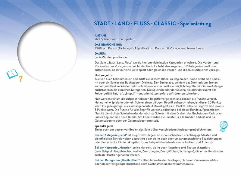Erlebt unvergessliche Spielmomente mit dem neuen "Stadt-Land-Fluss Classic Edition"-Spielblock, der Spielspaß für die ganze Familie bietet. Dieser einzigartige Spielblock bringt den beliebten Klassiker zurück in eure Wohnzimmer mit 52 aufregenden Kategorien. Neben bewährten Favoriten, könnt ihr euch an neuen, witzigen und überraschenden Kategorien, die für viel Unterhaltung und zahlreiche Aha-Momente sorgen, versuchen. Ob bei einem gemütlichen Familienabend, einer ausgelassenen Feier mit Freunden oder einer Schlagabtausch-Runde im Büro die "Stadt-Land-Fluss Classic Edition" ist der ideale Begleiter. Die handliche Größe des Spielblocks ermöglicht es, ihn überallhin mitzunehmen, sodass Spaß niemals weit entfernt ist.