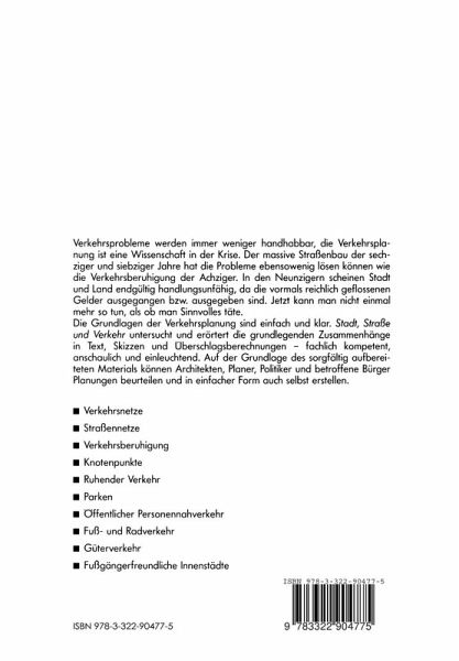 Verkehrsprobleme werden immer weniger handhabbar, die Verkehrsplanung ist eine Wissenschaft in der Krise. Der massive Straßenbau der sechziger und siebziger Jahre hat die Probleme ebensowenig lösen können wie die Verkehrsberuhigung der Achtziger. In den Neunzigern scheinen Stadt und Land endgültig handlungsunfähig, da die vormals reichlich geflossenen Gelder ausgegangen bzw. ausgegeben sind. Jetzt kann man nicht einmal mehr so tun, als ob man Sinnvolles täte. Immer mehr Menschen fahren Auto. Städte und Landschaften verstopfen, die Umweltbelastungen aus Verkehr nehmen bedrohliche Züge an. In dieser Krise, in der klar und konsequent nach Lösungen gesucht werden müßte, haben Verkehrsplaner ihre Orientierung verloren. Sie resignieren, verstecken ihr Nicht-mehr-weiter-wissen hinter arrogantem Expertengehabe oder flüchten in technische Spielereien. Die Fachwelt ist derart verwirrt, daß sie kaum einen verständlichen Überblick über das Geschehen geben kann. So können sich erst recht Lernende, betroffene Bürger, Journalisten, Politiker oder Planer anderer Fachrichtungen kein Urteil mehr bilden. Die Grundlagen der Verkehrsplanung sind jedoch einfach und klar. "Stadt, Straße und Verkehr" untersucht und erörtert die grundlegenden Zusammenhänge in Text, Skizzen und Überschlagsberechnungen - fachlich kompetent, anschaulich und einleuchtend. Auf der Grundlage des sorgfältig aufbereiteten Materials können Architekten, Planer und Verkehrsplaner eigene Planungen beurteilen bzw. überarbeiten. Ein Handbuch! (...) Füsser erläutert alle verkehrsplanerischen Maßnahmen - auch für Nicht-Fachleute - in klarer und verständlicher Weise.(...) (...) anschaulich und klar insbesondere für Kommunalpolitiker in Planungs- und Verkehrsausschüssen aufschlußreich. (...) Das Parlament Ausgabe Nr. 43, S.19 vpm 17.10.97 Rezension erschienen in ekz-Bibl. Bereich 1998 (...) interessante Details und verständlich geschrieben (...)