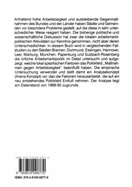 I. Grenzen und Möglichkeiten lokaler Politik gegen Arbeitslosigkeit.- A. Arbeitslosigkeit Problementwicklung, Politikprozesse, politische und wissenschaftliche Diskussion.- 1. Arbeitslosigkeit Problementwicklung und Politikprozesse.- 2. Arbeitslosigkeit und lokale Politikforschung.- B. Zur Bestimmung lokaler Handlungsspielräume.- 1. Die Schwäche der lokalen Ebene in vertikalen Politikprozessen.- 2. Lokale Politikprozesse und das lokale politische System.- 2.1. Die Kommune ihre arbeitsmarkt- und sozialpolitischen Handlungsspielräume und Mechanismen pluralistischer Interessenartikulation und -Vermittlung.- 2.2. Arbeitsämter örtliche Bedingungen institutionalisierter Arbeitsmarktpolitik und Selbstverwaltung.- 2.3. Programmförderung durch überörtliche staatliche Akteure Ortsferne Steuerung und lokale Umsetzung.- 2.4. Intermediäre Leistungserbringung und Interessenvermittlung durch Maßnahmeträger und Sozial-Advokaten.- 2.5. Betriebliche Auseinandersetzungen und unternehmensbezogene Vereinbarungen der eigentliche lokale Korporatismus .- 2.6. Public/Private Interplay . Steuerungsprobleme und -möglichkeiten lokaler Politik.- 2.7. Zu unterschiedlichen Logiken politischer Entscheidungen auf lokaler Ebene.- 3. Zur räumlichen Dimension gesellschaftlicher Prozesse.- 3.1. Urban management als Voraussetzung für die Schaffung hochdifferenzierter Produktions- und Reproduktionsbedingungen.- 3.2. Die zur Fiktion gewordene local economy und die Notwendigkeit selektiver Strategien zur Verhinderung sozialer Marginalisierungsprozesse.- C. What makes the difference? Zum Problem, lokal unterschiedliche Aktivitäten gegen Arbeitslosigkeit politikwissenschaftlich zu erklären.- 1. Zur Notwendigkeit vergleichender Untersuchungen.- 2. Das Arenakonzept als Analyserahmen für vergleichende Fallstudien.- 2.1. Zum Begriff der Politik-Arena.- 2.2. Faktoren der Arenafärbung.- 2.3. Zu unterschiedlichen Ebenen der Konflikt- und Konsensbildung.- D. Zur Forschungs- und Darstellungsweise.- II. Problemlagen und ausgewählte lokale Aktivitäten im Vergleich.- A Arbeitslosigkeit und Sozialhilfebedürftigkeit als Handlungsanforderungen an örtliche Akteure.- 1. Struktur der Arbeitslosigkeit und soziale Merkmale der Arbeitslosen in den ausgewählten Arbeitsamtsbezirken.- 1.1. Allgemeine Strukturmerkmale der Arbeitsmarktlage.- 1.2. Zur Struktur der Arbeitslosen.- 1.2.1. Arbeitsamtsbezirk Bremen.- 1.2.2. Arbeitsamtsbezirk Hannover.- 1.2.3. Arbeitsamtsbezirk Dortmund.- 1.2.4. Arbeitsamtsbezirk Leer.- 1.2.5. Arbeitsamtsbezirk Schwandorf.- 1.2.6. Arbeitsamtsbezirk Marburg.- 1.2.7. Arbeitsamtsbezirk Göppingen.- 2. Arbeitslosigkeit, Sozialhilfebedürftigkeit und finanzielle Belastungen von Kommunen.- 2.1. Arbeitslosigkeit und die Entwicklung der Sozialhilfeempfänger.- 2.1.1. Die Entwicklung der HLU-Empfängerdichte.- 2.1.2. Strukturverschiebungen bei den HLU-Empfängern.- 2.2. Finanzielle Auswirkungen des zunehmenden Sozialleistungsbezuges für die Kommunen.- B. Lokale Aktivitäten gegen Arbeitslosigkeit.- 1. Arbeitsbeschaffungsmaßnahmen.- 1.1. Zur quantitativen Entwicklung des Einsatzes von ABM.- 1.2. Der Einsatz von Arbeitsbeschaffungsmaßnahmen im Jahr 1986.- 1.3. Beteiligung von Kommunen an Arbeitsbeschaffungsmaßnahmen.- 2. Maßnahmen gegen Jugendarbeitslosigkeit.- 2.1. Allgemeine Charakterisierung.- 2.2. Zur Bedeutung kommunalen Engagements.- 3. Beschäftigung von Sozialhilfeempfängern nach 19 BSHG.- 3.1. Das Instrumentarium.- 3.2. Zum unterschiedlichen Einsatz durch Kommunen.- C. Problemlagen, ausgewählte lokale Aktivitäten und die Bedeutung der Städtestudien.- III. Städtestudien.- A. Bremen.- 1. Wirtschaft und Arbeitsmarkt.- 1.1. Wirtschaftliche Entwicklung Bremens.- 1.2. Entwicklung und Strukturmerkmale der Arbeitslosigkeit.- 1.3. Arbeitslosigkeit und Sozialhilfebedürftigkeit.- 2. Arbeitsmarktpolitische Maßnahmen in Bremen.- 2.1. Thematisierung von arbeitsmarkt- und sozialpolitischen Problemen.- 2.2. Arbeitsmarktpolitische Maßnahmen des Arbe