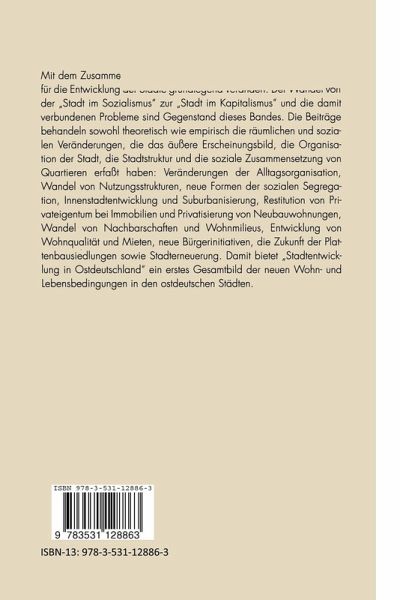 Von der Stadt im Sozialismus zur Stadt im Kapitalismus - Zusammenleben und Auseinanderleben. Veränderungen sozialer Lagen und Beziehungen in Ostdeutschland - Entdifferenzierung als Hypothek - Differenzierung als Aufgabe: Zur Entwicklung der ostdeutschen Großsiedlungen - Volkswohnungsbestand in Spekulantenhand? Zu den möglichen Folgen der Privatisierung von ehemals volkseigenen Wohnungen in den neuen Bundesländern - Restitution: Wie funktioniert sie und was bewirkt sie? - '... und dann geht's doch'n bißchen auseinander' Zum Wandel städtischer Wohnmilieus in den neuen Bundesländern - Die langen Wellen und die kurzen Momente - Dimensionen der sozialen Zeit und des sozialen Raums in der Stadtentwicklung Erfurts - Wieder die gleichen Fehler? Verkehrssituation und -planung in ostdeutschen Städten - Bürgerinitiativen nach der Wende. Zur Entstehung von Stadtteil- und Bürgerinitiativen in der Stadt Leipzig seit 1989 - Kommunale Armutspolitik in Ostdeutschland - Armutslagen und Strategien ihrer Bekämpfung in ausgewählten Kommunen im Land Sachsen-Anhalt - Verbesserung der Wohnqualität und Entwicklung der Mieten in den neuen Bundesländern seit der Vereinigung - Stadtentwicklung in Leipzig: zwischen Verfall und Deindustrialisierung, Sanierung und tertiären Großprojekten - Verlieren die Kernstädte? Konkurrenz zwischen Stadt und Umland bei der Gewerbeentwicklung am Beispiel Leipzig - Probleme der Transformation städtischen Lebens und Wohnens in kleinen und mittleren Städten der neuen Bundesländer.