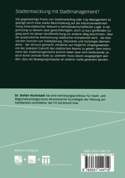 Die gegenwärtige Praxis von Stadtmarketing oder City-Management ist geprägt durch eine starke Beschränkung auf die Interessenwahrnehmung innerstädtischer Akteure in betriebswirtschaftlicher Logik. In Abgrenzung zu diesem zwar gerechtfertigten, doch zu kurz greifenden Zugang wird mit dieser Veröffentlichung ein anderer Weg beschritten: Über die ausdrückliche Anerkennung städtischer Komplexität wird - die klassischen Grenzen von Stadtplanung, Ökonomie und Soziologie überwindend - der Versuch gemacht, Hinweise auf mögliche Umgangsweisen mit der prekären Zukunft des städtischen Raums zu geben. Dem Instrument des Stadtmanagements kommt dabei zwar eine bedeutende, jedoch keine zentrale Rolle zu; vielmehr muss davon ausgegangen werden, dass die Bewegungsimpulse an anderer Stelle generiert werden.