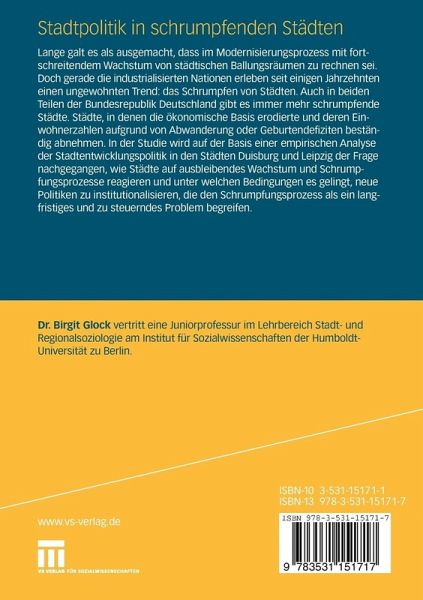 Lange galt es als ausgemacht, dass im Modernisierungsprozess mit fortschreitendem Wachstum von städtischen Ballungsräumen zu rechnen sei. Doch gerade die industrialisierten Nationen erleben seit einigen Jahrzehnten einen ungewohnten Trend: das Schrumpfen von Städten. Auch in beiden Teilen der Bundesrepublik Deutschland gibt es immer mehr schrumpfende Städte. Städte, in denen die ökonomische Basis erodierte und deren Einwohnerzahlen aufgrund von Abwanderung oder Geburtendefiziten beständig abnehmen. In der Studie wird auf der Basis einer empirischen Analyse der Stadtentwicklungspolitik in den Städten Duisburg und Leipzig der Frage nachgegangen, wie Städte auf ausbleibendes Wachstum und Schrumpfungsprozesse reagieren und unter welchen Bedingungen es gelingt, neue Politiken zu institutionalisieren, die den Schrumpfungsprozess als ein langfristiges und zu steuerndes Problem begreifen.