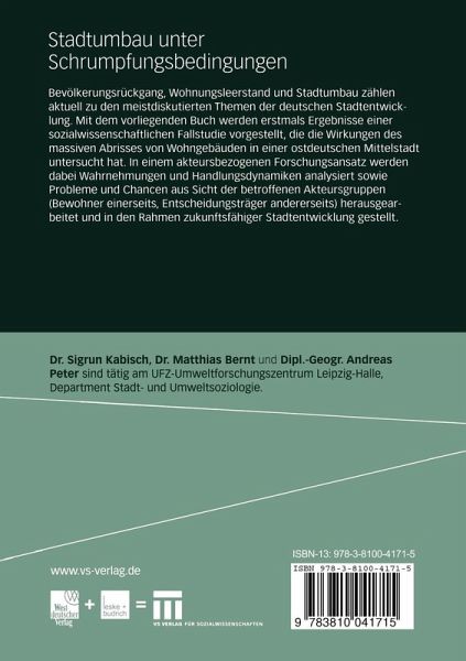 Bevölkerungsrückgang, Wohnungsleerstand und Stadtumbau zählen aktuell zu den meistdiskutierten Themen der deutschen Stadtentwicklung. Mit dem vorliegenden Buch werden erstmals Ergebnisse einer sozialwissenschaftlichen Fallstudie vorgestellt, die die Wirkungen des massiven Abrisses von Wohngebäuden in einer ostdeutschen Mittelstadt untersucht hat. In einem akteursbezogenen Forschungsansatz werden dabei Wahrnehmungen und Handlungsdynamiken analysiert sowie Probleme und Chancen aus Sicht der betroffenen Akteursgruppen (Bewohner einerseits, Entscheidungsträger andererseits) herausgearbeitet und in den Rahmen zukunftsfähiger Stadtentwicklung gestellt.