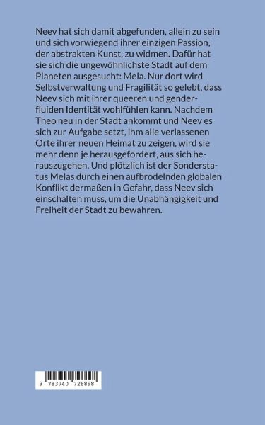 Neev hat sich damit abgefunden, allein zu sein und sich vorwiegend ihrer einzigen Passion, der abstrakten Kunst, zu widmen. Dafür hat sie sich die ungewöhnlichste Stadt auf dem Planeten ausgesucht: Mela. Nur dort wird Selbstverwaltung und Fragilität so gelebt, dass Neev sich mit ihrer queeren und genderfluiden Identität wohlfühlen kann. Nachdem Theo neu in der Stadt ankommt und Neev es sich zur Aufgabe setzt, ihm alle verlassenen Orte ihrer neuen Heimat zu zeigen, wird sie mehr denn je herausgefordert, aus sich herauszugehen. Und plötzlich ist der Sonderstatus Melas durch einen aufbrodelnden globalen Konflikt dermaßen in Gefahr, dass Neev sich einschalten muss, um die Unabhängigkeit und Freiheit der Stadt zu bewahren.