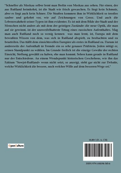 "Schneller als Moskau selber lernt man Berlin von Moskau aus sehen. Für einen, der aus Rußland heimkehrt, ist die Stadt wie frisch gewaschen. Es liegt kein Schmutz, aber es liegt auch kein Schnee. Die Straßen kommen ihm in Wirklichkeit so trostlos sauber und gekehrt vor, wie auf Zeichnungen von Grosz. Und auch die Lebenswahrheit seiner Typen ist ihm evidenter. Es ist mit dem Bilde der Stadt und der Menschen nicht anders als mit dem der geistigen Zustände: die neue Optik, die man auf sie gewinnt, ist der unzweifelhatteste Ertrag eines russischen Aufenthaltes. Mag man auch Rußland noch so wenig kennen was man lernt, ist, Europa mit dem bewußten Wissen von dem, was sich in Rußland abspielt, zu beobachten und zu beurteilen. Das ttällt dem einsichtsvollen Europäer als erstes in Rußland zu. Darum ist andrerseits der Aufenthalt ür Fremde ein so sehr genauer Prüfstein. Jeden nötigt er, seinen Standpunkt zu wählen. Im Grunde freilich ist die einzige Gewähr der rechten Einsicht, Stellung gewählt zu haben, ehe man kommt. Sehen kann gerade in Rußland nur der Entschiedene. An einem Wendepunkt historischen Geschehens, wie ihn das Faktum "Sowjet-Rußland« wenn nicht setzt, so anzeigt, steht gar nicht zur Debatte, welche Wirklichkeit die bessere, noch welcher Wille auf dem besseren Wege sei."