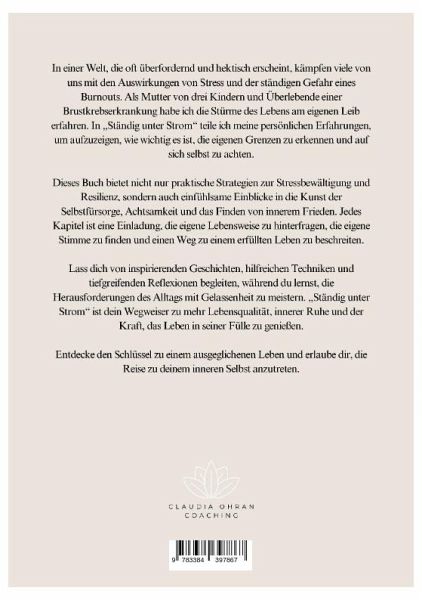 In meinem Buch geht es um die vielen Herausforderungen, die das moderne Leben mit sich bringt, insbesondere in Bezug auf Stress und Burnout. Ich lade dich ein, mit mir auf eine Reise zu gehen, die nicht nur aus theoretischen Konzepten besteht, sondern tief in meinen persönlichen Erfahrungen verwurzelt ist. Als Ehefrau und berufstätige Mutter habe ich oft das Gefühl erlebt, in einem ständigen Balanceakt zwischen familiären Verpflichtungen, beruflichen Anforderungen und dem eigenen Bedürfnis nach Ruhe und Erholung zu stehen. Diese Erfahrungen haben mich gelehrt, wie schnell man sich verloren fühlen kann, wenn der Alltag überhandnimmt.Zudem habe ich die erschütternden Lektionen, die mir meine Brustkrebserkrankung erteilt hat, in die Seiten dieses Buches einfließen lassen. Diese Zeit hat mir nicht nur die Zerbrechlichkeit des Lebens vor Augen geführt, sondern auch die immense Stärke, die in uns allen schlummert. Ich möchte dir zeigen, dass es in den dunkelsten Momenten immer einen Weg zurück zur Lichtseite gibt - einen Weg, der oft durch das Erkennen der eigenen Bedürfnisse und Grenzen führt.In meinem Buch teile ich, wie wichtig es ist, die Warnsignale des Körpers ernst zu nehmen. Zu oft ignorieren wir die Anzeichen von Stress und Erschöpfung, bis es zu spät ist. Ich werde dir helfen, diese Signale zu erkennen und die notwendigen Schritte zur Selbstfürsorge zu unternehmen. Du wirst lernen, wie du Achtsamkeit in deinen Alltag integrieren kannst und welche praktischen Techniken dir helfen können, die Kontrolle über dein Wohlbefinden zurückzugewinnen.Darüber hinaus geht es darum, Resilienz zu entwickeln - die Fähigkeit, auch in schwierigen Zeiten stark zu bleiben. Ich werde dir konkrete Strategien an die Hand geben, die du sofort umsetzen kannst, um dein emotionales und körperliches Wohlbefinden zu stärken. Mein Ziel ist es, dir nicht nur Wissen zu vermitteln, sondern dir auch das Gefühl zu geben, dass du nicht allein bist auf deinem Weg.Ich hoffe, dass dieses Buch dir Mut macht und dir zeigt, dass es immer einen Ausweg gibt, auch wenn die Herausforderungen groß erscheinen. Es geht darum, sich selbst an erste Stelle zu setzen und aktiv für das eigene Wohlbefinden zu kämpfen. Letztendlich möchte ich, dass du mit den Werkzeugen, die du hier findest, deinen eigenen, erfüllten Lebensweg gestalten kannst - einen Weg, der dich zu innerer Ruhe und Zufriedenheit führt.