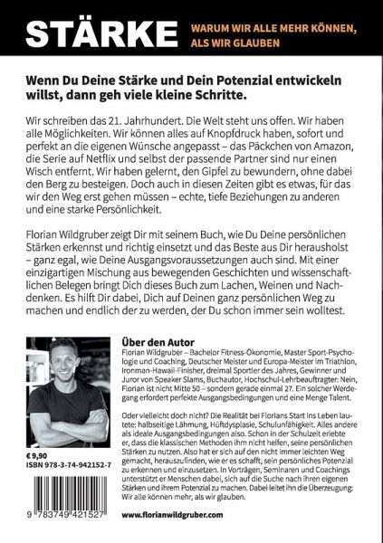 Florian Wildgruber - Bachelor Fitness-Ökonomie, Master Sport-Psychologie und Coaching, Deutscher Meister und Europa-Meister im Triathlon, Ironman-Hawaii-Finisher, dreimal Sportler des Jahres, Gewinner und Juror von Speaker Slams, Buchautor, Hochschul-Lehrbeauftragter: Nein, Florian ist nicht Mitte 50 - sondern gerade einmal 27. Ein solcher Werdegang erfordert perfekte Ausgangsbedingungen und eine Menge Talent. Oder vielleicht doch nicht? Die Realität bei Florians Start ins Leben lautete: halbseitige Lähmung, Hüftdysplasie, Schulunfähigkeit. Alles andere als ideale Ausgangsbedingungen also. Schon in der Schulzeit erlebte er, dass die klassischen Methoden ihm nicht helfen, seine persönlichen Stärken zu nutzen. Also hat er sich auf den nicht immer leichten Weg gemacht, herauszufinden, wie er es schafft, sein persönliches Potenzial zu erkennen und einzusetzen. In Vorträgen, Seminaren und Coachings unterstützt er Menschen dabei, sich auf die Suche nach ihren eigenen Stärken und ihrem Potenzial zu machen. Dabei leitet ihn die Überzeugung: Wir alle können mehr, als wir glauben.
