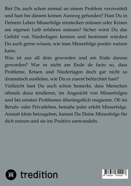 Bist Du auch schon einmal an einem Problem verzweifelt und hast bei diesem keinen Ausweg gefunden? Hast Du in Deinem Leben Misserfolge einstecken müssen oder Krisen am eigenen Leib erfahren müssen? Sicher wirst Du das Gefühl von Niederlagen kennen und bestimmt würdest Du auch gerne wissen, wie man Misserfolge positiv nutzen kann.Was ist aus all dem geworden und am Ende daraus geworden? War es nicht am Ende de facto so, dass Probleme, Krisen und Niederlagen doch gar nicht so dramatisch ausfielen, wie Du es zuerst befürchtet hast?Vielleicht hast Du auch schon bemerkt, dass Menschen oftmals dazu tendieren, im Angesicht von Misserfolgen und bei ernsten Problemen überängstlich reagieren. Ob im Berufs- oder Privatleben, beinahe jeder erlebt Misserfolge. Anstatt klein beizugeben, kannst Du Deine Misserfolge für dich nutzen und sie ins Positive umwandeln.