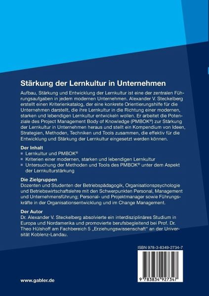 Aufbau, Stärkung und Entwicklung der Lernkultur ist eine der zentralen Führungsaufgaben in jedem modernen Unternehmen. Alexander V. Steckelberg erstellt einen Kriterienkatalog, der eine konkrete Orientierungshilfe für die Unternehmen darstellt, die ihre Lernkultur in die Richtung einer modernen, starken und lebendigen Lernkultur entwickeln wollen. Er arbeitet die Potenziale des Project Management Body of Knowledge (PMBOK®) zur Stärkung der Lernkultur in Unternehmen heraus und stellt ein Kompendium von Ideen, Strategien, Methoden, Techniken und Tools zusammen, die effektiv für die Entwicklung und Stärkung der Lernkultur eingesetzt werden können.