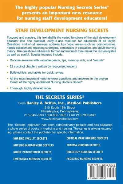 Staff Development Nursing Secrets is a practical guide for nurse educators working in staff development. The question and answer format helps provide readers with specific answers to their everyday questions and challenges. The text explores the state of today's healthcare world and identifies the myriad of competencies and skills necessary for a nurse educator to succeed. In addition, nurse educators will gain useful tips and knowledge regarding the planning, implementation and evaluation of many types of educational programming. The text concludes with a section on the nuts and bolts of common staff development programs.Engaging, interactive Q & A format