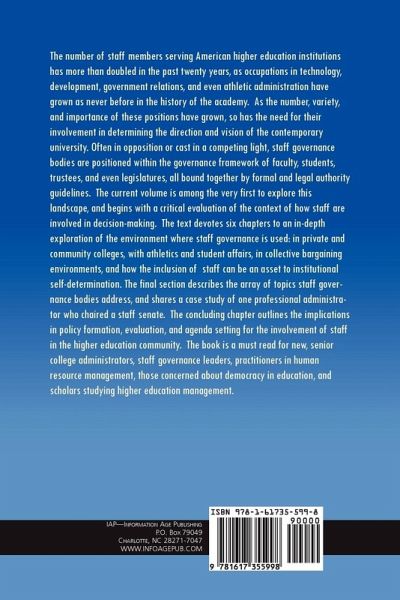 A volume in Educational Policy in the 21st Century: Opportunities, Challenges, and Solutions Series Editor Bruce Anthony Jones,University of South Florida The number of staff members serving American higher education institutions has more than doubled in the past twenty years, as occupations in technology, development, government relations, and even athletic administration have grown as never before in the history of the academy. As the number, variety, and importance of these positions have grown, so has the need for their involvement in determining the direction and vision of the contemporary university. Often in opposition or cast in a competing light, staff governance bodies are positioned within the governance framework of faculty, students, trustees, and even legislatures, all bound together by formal and legal authority guidelines. The current volume is among the very first to explore this landscape, and begins with a critical evaluation of the context of how staff are involved in decision-making. The text devotes six chapters to an in-depth exploration of the environment where staff governance is used: in private and community colleges, with athletics and student affairs, in collective bargaining environments, and how the inclusion of staff can be an asset to institutional self-determination. The final section describes the array of topics staff governance bodies address, and shares a case study of one professional administrator who chaired a staff senate. The concluding chapter outlines the implications in policy formation, evaluation, and agenda setting for the involvement of staff in the higher education community. The book is a must read for new, senior college administrators, staff governance leaders, practitioners in human resource management, those concerned about democracy in education, and scholars studying higher education management.