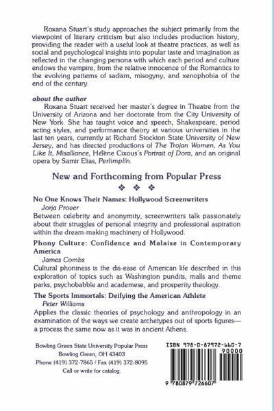 Vampires, since they found a home in the psyche of the West 250 years ago, have always been objects of fascination for popular audiences. Recently they have gained the attention of scholars in the fields of popular culture, literary history, folklore, and cultural anthropology. Now reduced to a cliche and figure of fun, the vampire originally took on its characteristics in the public imagination from a series of plays written and performed by some of the most important figures in 19th-century theatre: Dion Boucicault, Eugene Scribe, Alexandre Dumas pere, Gilbert and Sullivan, Charles Nodier, T.P. Cooke, Marie Dorval, and J.R. Planche. Roxana Stuart's study approaches the subject primarily from the viewpoint of literary criticism but also includes production history, providing the reader with a useful look at theatre practices, as well as social and psychological insights into popular taste and imagination as reflected in the changing persona with which each period and culture endows the vampire, from the relative innocence of the Romantics to the evolving patterns of sadism, misogyny, and xenophobia of the end of the century.