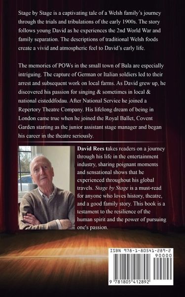 Stage by Stage is a captivating tale of a Welsh family's journey through the trials and tribulations of the early 1900s. The story follows young David as he experiences the 2nd World War and family separation. The descriptions of traditional Welsh foods create a vivid and atmospheric feel to David's early life. The memories of POWs in the small town of Bala are especially intriguing. The capture of German or Italian soldiers led to their arrest and subsequent work on local farms. As David grew up, he discovered his passion for singing & sometimes in local & national eisteddfodau. After National Service he joined a Repertory Theatre Company. His lifelong dream of being in London came true when he joined the Royal Ballet, Covent Garden starting as the junior assistant stage manager and began his career in the theatre seriously. David Rees takes readers on a journey through his life in the entertainment industry, sharing poignant moments and sensational shows that he experienced throughout his global travels. Stage by Stage is a must-read for anyone who loves history, theatre, and a good family story. This book is a testament to the resilience of the human spirit and the power of pursuing one's passion.