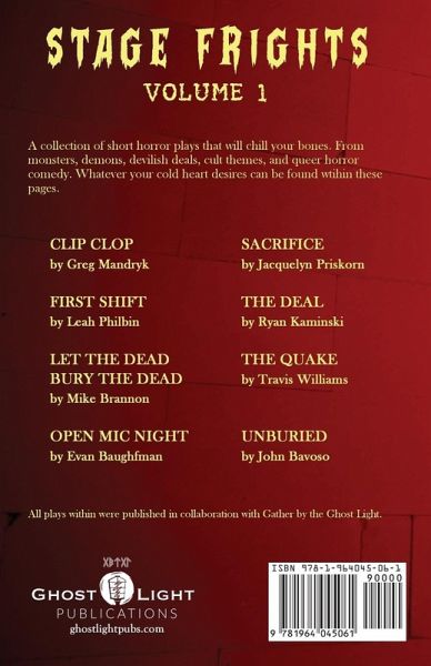 A collection of short horror plays that will chill your bones. Monsters, demons, devilish deals, cult themes, and queer comedy horror. Whatever your cold heart desires can be found wtihin these pages. Short plays written by Greg Mandryk, Leah Philbin, Mike Brannon, Evan Baughfman, Jacquelyn Priskorn, Ryan Kaminski, Travis Williams, and John Bavoso. Published in collaboration with Gather by the Ghost Light.