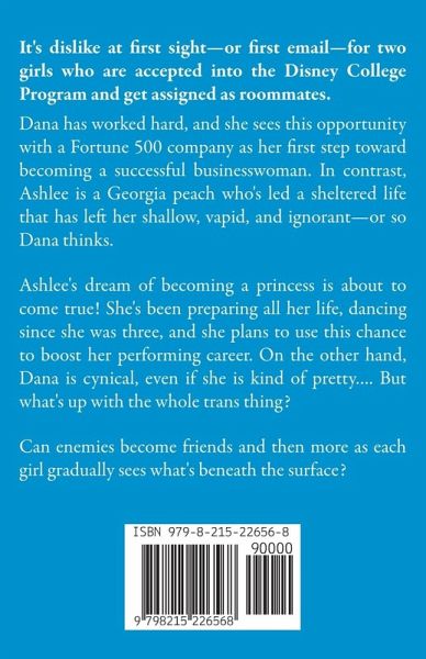 It's dislike at first sight-or first email-for two girls who are accepted into the Disney College Program and get assigned as roommates. Dana has worked hard, and she sees this opportunity with a Fortune 500 company as her first step toward becoming a successful businesswoman. In contrast, Ashlee is a Georgia peach who's led a sheltered life that has left her shallow, vapid, and ignorant-or so Dana thinks. Ashlee's dream of becoming a princess is about to come true! She's been preparing all her life, dancing since she was three, and she plans to use this chance to boost her performing career. On the other hand, Dana is cynical, even if she is kind of pretty…. But what's up with the whole trans thing? Can enemies become friends and then more as each girl gradually sees what's beneath the surface?