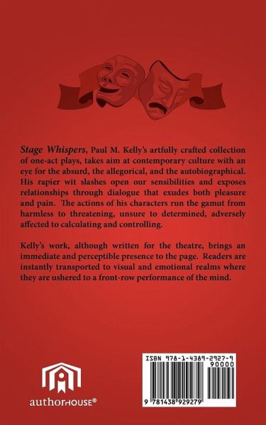 Stage Whispers, Paul M. Kelly's artfully crafted collection of one-act plays, takes aim at contemporary culture with an eye for the absurd, the allegorical, and the autobiographical. His rapier wit slashes open our sensibilities and exposes relationships through dialogue that exudes both pleasure and pain. The actions of his characters run the gamut from harmless to threatening, unsure to determined, adversely affected to calculating and controlling. Kelly's work, although written for the theatre, brings an immediate and perceptible presence to the page. Readers are instantly transported to visual and emotional realms where they are ushered to a front-row performance of the mind.