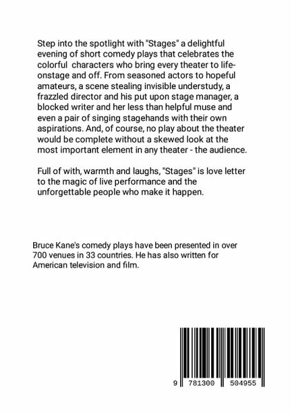 Step into the spotlight with Stages, a delightful evening of short comedy plays that celebrate the colorful characters who bring every theater to life-onstage and off. From seasoned actors to hopeful amateurs, a scene-stealing invisible understudy, a frazzled director, a stage manager keeping the chaos at bay, a blocked writer and her mischievous muse, even a pair of singing stagehands-no one escapes the drama (or the laughs). And, of course, no show would be complete without the most vital part of any theater... the audience. Full of wit, warmth, and backstage mayhem, Stages is a love letter to the magic of live performance and the unforgettable people who make it happen.
