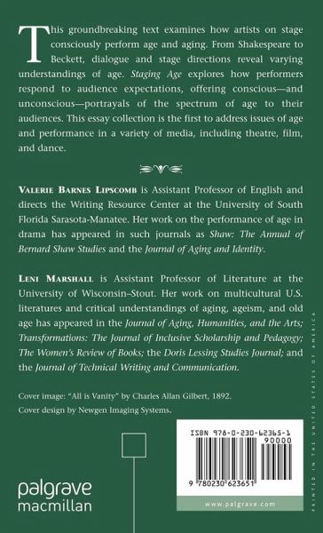 "Age Studies here moves briskly into the entertainment biz.Smart critics, steeped in the fascinations of performance, some of them practitioners, write against the grain of the cult of youth and thereby venture into surprising territories. Why old cops in Hollywood movies can't retire. How good theater actresses enliven non-young women characters in the limitedtradition that followed Shakespeare. How to get non-old actors to sound old when playing Becket characters.This book amplifies the range of critical issues, stretching what Age Studies can think and change. - Margaret Morganroth Gullette, author of Aged by Culture and Agewise