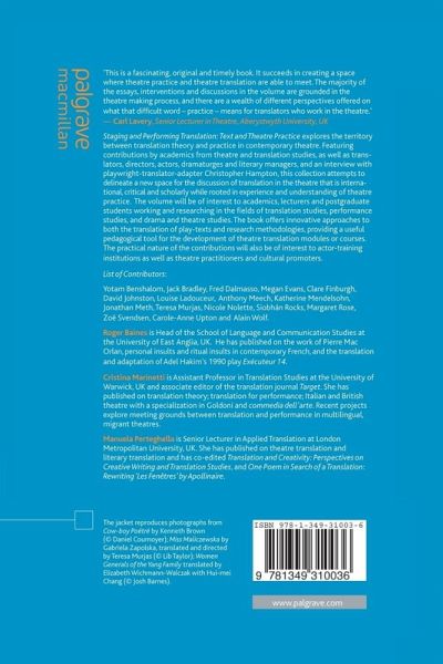This exploration of the territory between theory and practice in contemporary theatre features essays by academics from theatre and translation studies, and delineates a new space for the discussion of translation in the theatre that is international, critical and scholarly, while rooted in experience and understanding of theatre practices.