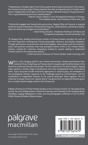 Ruru Li's new edited book Staging China is the first comprehensive English-language study of Chinese drama in the new Millennium. Through rich historical surveys and case studies, the book maps out the complex of trajectories in which Chinese drama re-modernized itself amid political dynamics, artistic innovations, and intellectual debates. Historically engaged and theoretically provocative, Staging China will become a required reader for anyone interested in Chinese performing arts, cultural politics, and theatre studies. I give the volume my strongest recommendation." - David Wang, Edward C. Henderson Professor of Chinese and Comparative Literature, Harvard University, USA