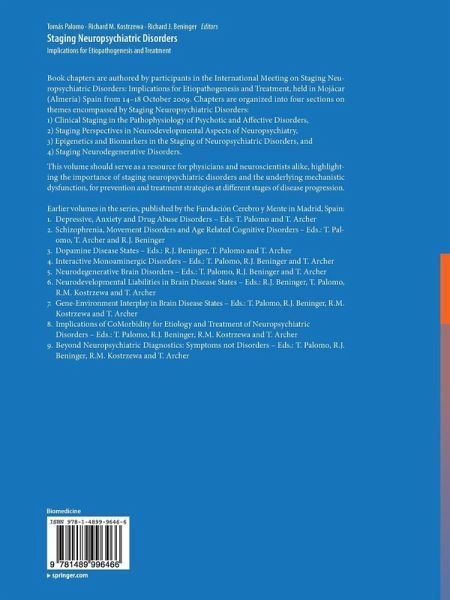 Book chapters are authored by participants in the International Meeting on Staging Neuropsychiatric Disorders: Implications for Etiopathogenesis and Treatment , held in Mojácar (Almería) Spain from 14-18 October 2009. Chapters are organized into four sections on themes encompassed by Staging Neuropsychiatric Disorders: 1) Clinical Staging in the Pathophysiology of Psychotic and Affective Disorders, 2) Staging Perspectives in Neurodevelopmental Aspects of Neuropsychiatry, 3) Epigenetics and Biomarkers in the Staging of Neuropsychiatric Disorders, and 4) Staging Neurodegenerative Disorders. This volume should serve as a resource for physicians and neuroscientists alike, highlighting the importance of staging neuropsychiatric disorders and the underlying mechanistic dysfunction, for prevention and treatment strategies at different stages of disease progression.
