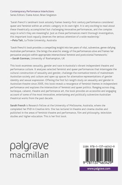 This book examines sexuality, gender and race in Australia's vibrant independent theatre and performance culture. It analyses selected feminist and queer performances that interrogate the cultural construction of sexuality and gender, challenge the normative trends of mainstream Australian society and culture and open up spaces for alternative representations of gender identity and sexual expression. Offering the first full-length study on sexuality and gender in Australian theatre since 2005, this book reveals a resurgence of feminist themes in independent performance and explores the intersection of feminist and queer politics. Ranging across drag, burlesque, cabaret, theatre and performance art, the book provides an accessible and engaging account of some of the most innovative, entertaining and politically subversive Australian theatrical works from the past decade.