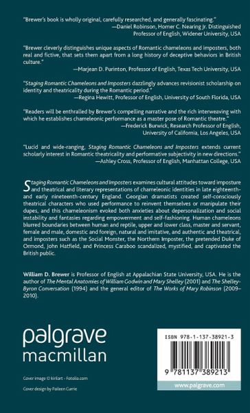 "William D. Brewer's Staging Romantic Cha-meleons and Imposters proposes a broad definition of theatricality that moves from the stage to the page and from the world of fiction to real-life imposters. ... This book will interest not only scholars of the period's drama but also students of, say, Keatsian poetics or Byronic mobility." (Recent Studies in the Nineteenth Century, Vol. 56 (4), Autumn, 2016)