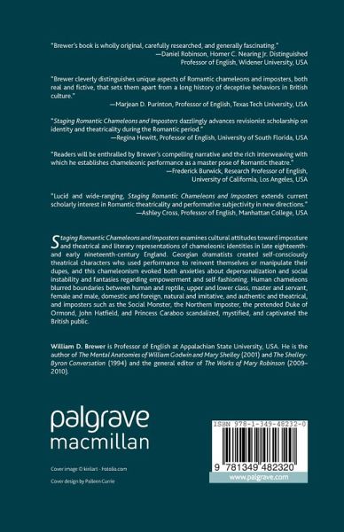 "William D. Brewer's Staging Romantic Cha-meleons and Imposters proposes a broad definition of theatricality that moves from the stage to the page and from the world of fiction to real-life imposters. ... This book will interest not only scholars of the period's drama but also students of, say, Keatsian poetics or Byronic mobility." (Recent Studies in the Nineteenth Century, Vol. 56 (4), Autumn, 2016)